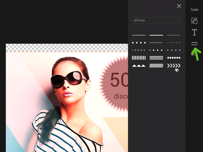 Choose the “Line” tool in the “Tools” menu. A panel will open, with lines of various shapes and sizes. Select the line that you deem the most appropriate for your design to add it to your image.