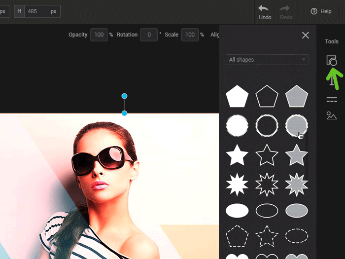 Click on the “Add a shape” tool to open the menu. Open the dropdown list to filter the images according to your needs. Simply click the desired form to add it to the image zone.