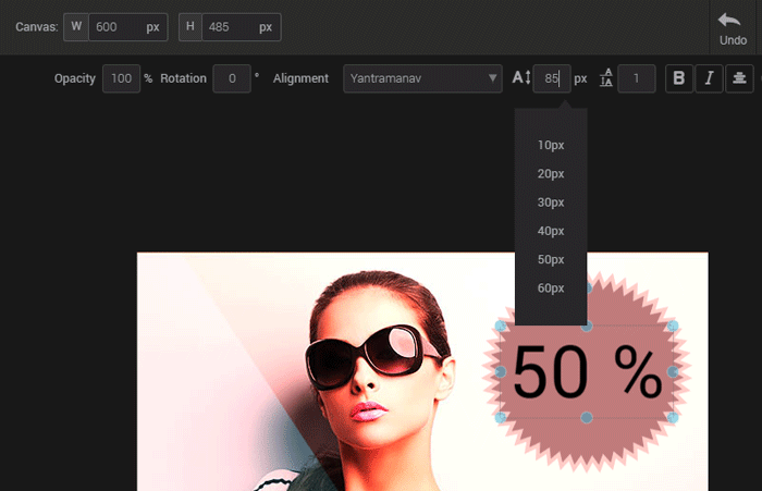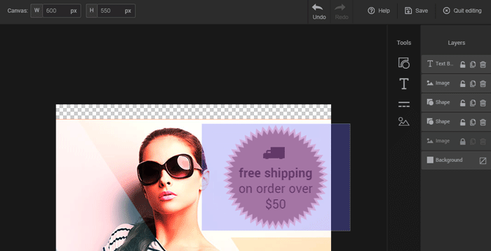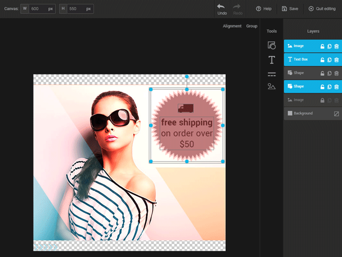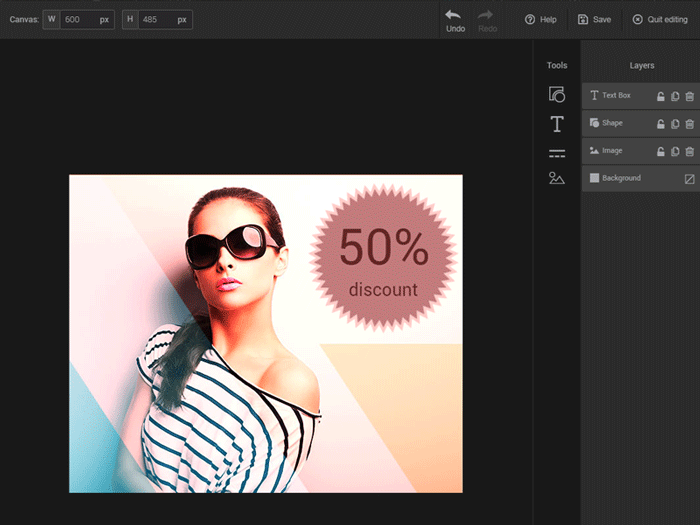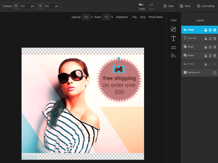 Put your images in the spotlight and enhance them, thanks to our image editor.  With this tool, you'll be able to crop and resize images, add various shapes or write catchy slogans. You'll even be able to create complex images by combining various components in layers.