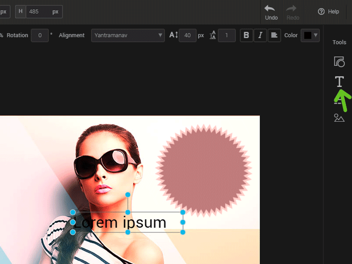 Click the “text” tool to add text to your image zone. To change your text, double click the layer directly in your image zone. You’ll then be able to select it or delete it to enter your own or make corrections to a previously entered text.