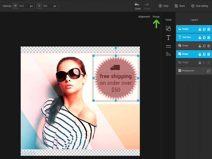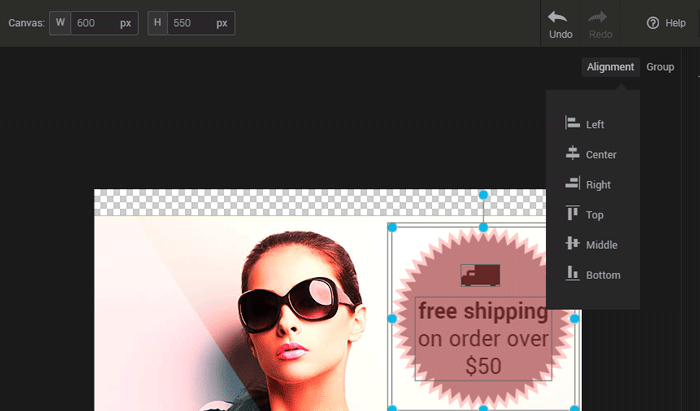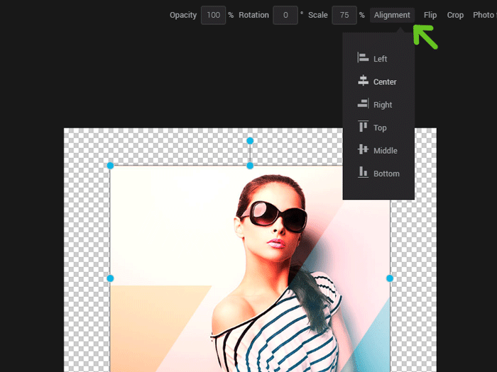 You can change the alignment of several layers at the same time by selecting them simultaneously and clicking the “Alignment” option that will appear once all your layers are selected. Use the “Group” option to fuse your components together and avoid unaligning them when moving your image. You can also rotate several components using this same method.