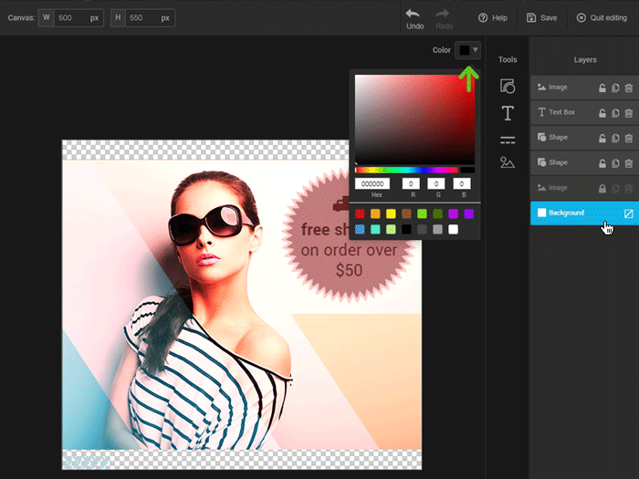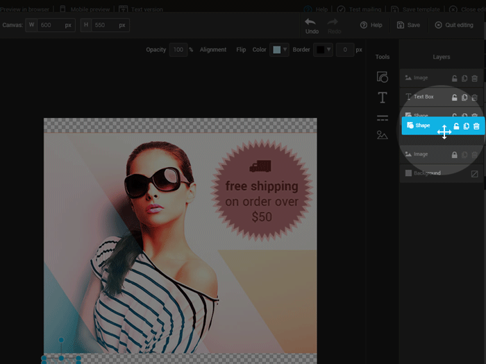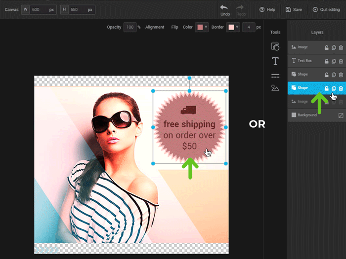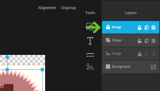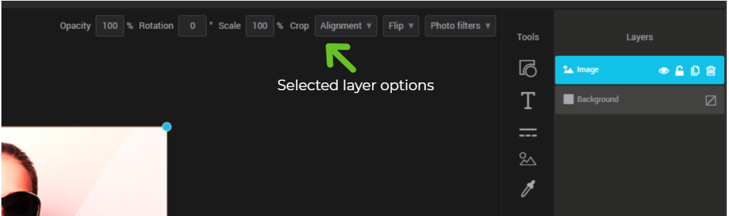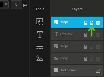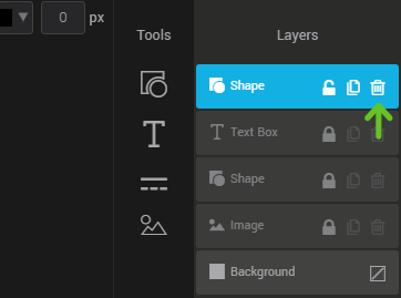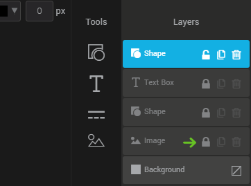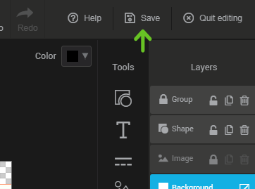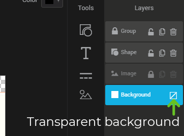 Each component added with the tools will create a new layer on the far right of the editor in the “layers” section. Drag the layers to change their display order. The background layer is the only layer that you can't delete. This layer defines the background of your image: it can be transparent or filled with a color.