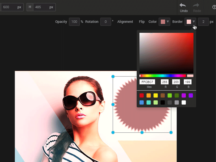 To change the color of the border and the shape, click your shape in the image zone or click the appropriate layer in the “Layers” menu on the right of the image editor. Once selected, click on the triangle on the right of the coloured square. To select your color, you can either: