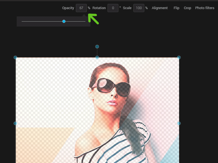 To change the opacity, click the image in the image zone or select the appropriate layer. Once done, click the percentage space. From there, either enter a value manually or move the cursor.
