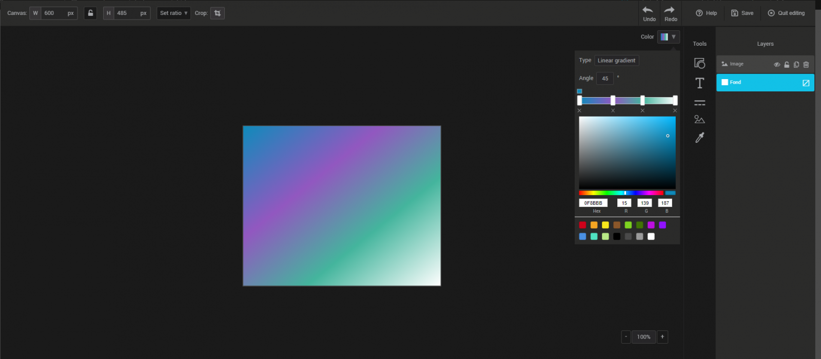 It is possible to apply a color gradient on shapes, text, dividers and on the background of your image.