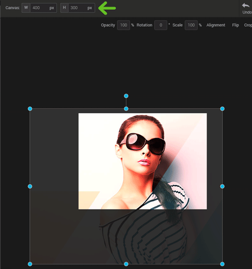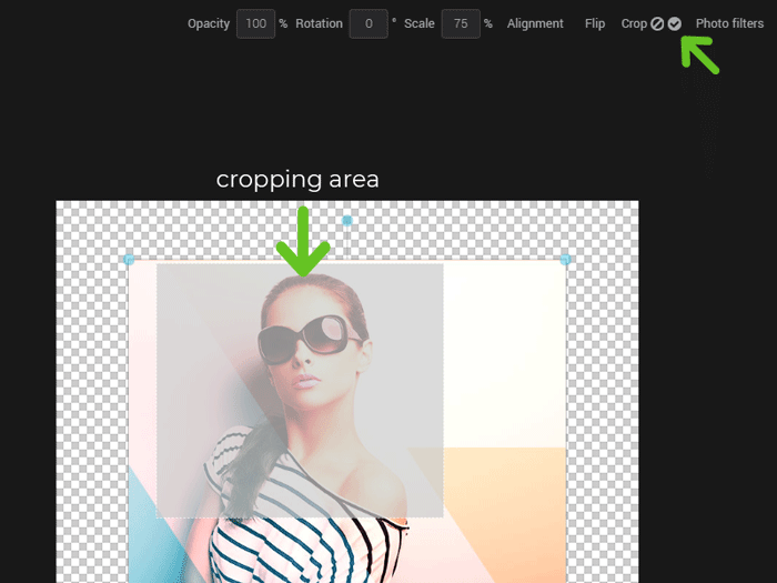 When you crop an image element, it will not affect the overall dimensions of your composition. Only the selected layer will be cropped. This means that your image may end up in the center of a too large image area (see the gridded rectangle visible in the illustration above) and there will be empty space around it. If you want to crop all the elements of your composition, change the dimensions of the canvas instead. Read more about this.