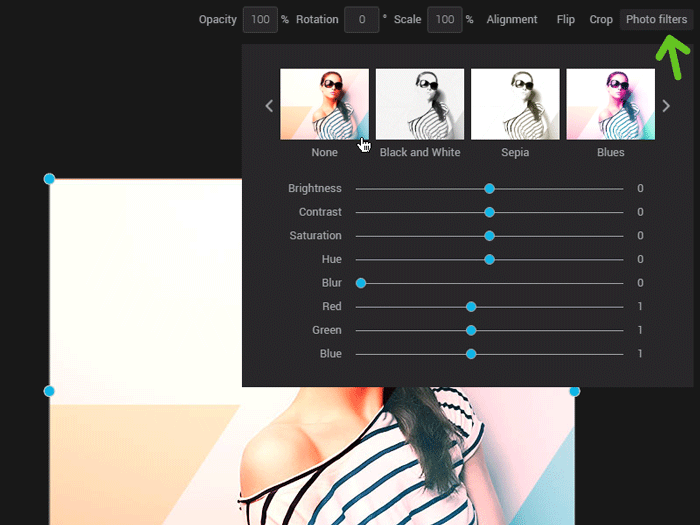 At the top of the filter menu, you’ll see a preview of various premade filters. Use the arrows to navigate through them and click a filter to apply it to your image. Premade filters are not stackable. Only the last filter selected will be applied to your image.