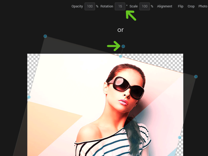 To rotate your image, select it then move the rotation axis on the top of your image to rotate it left or right. It is also possible to enter the exact number of degrees in the "Rotation" field.