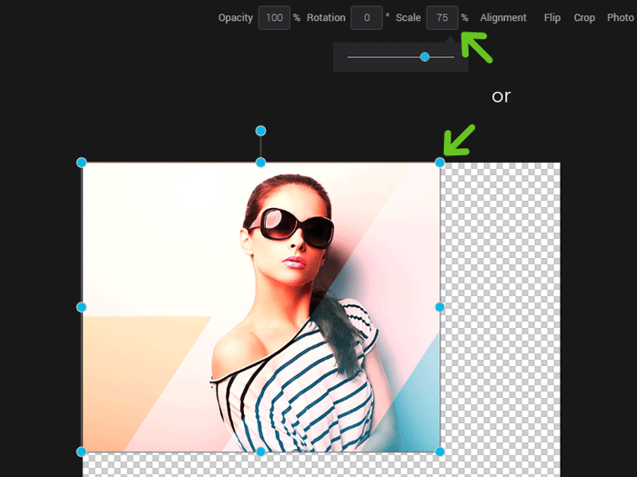 To proportionally resize your image, select your image and enter a percentage in the “Scale” box or slide the cursor. You can also click your image and move the corners (colored dots) to resize your image.