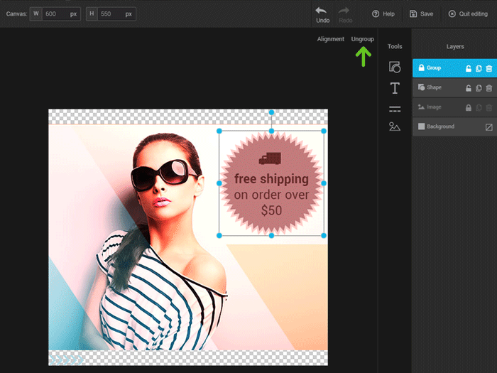 Once grouped, the layers can be moved as one. You won’t be able to apply modifications to layers separately, however. You can separate your different layers at any given time by clicking the “Ungroup” option.