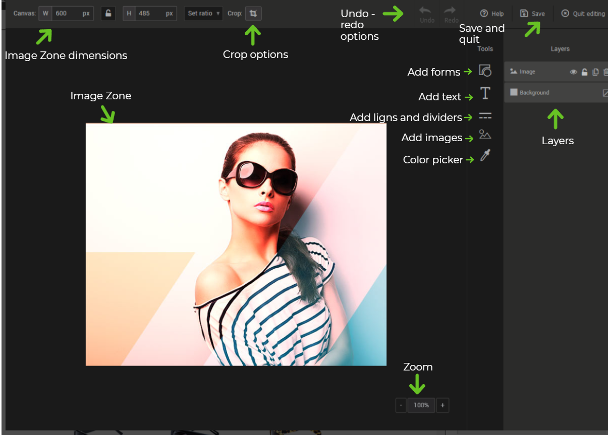 At the center of the editor is the “Image zone. ” Completely at the top left, you will find its dimensions and tools to re-frame it.