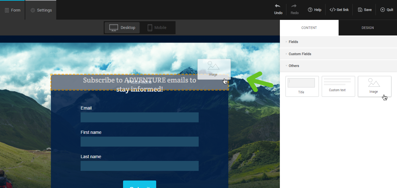 Go to the Content tab, located in the sidebar to your right. While keeping the left mouse button pressed, drag and drop the fields into the form. In addition to regular fields, you can also add custom fields.