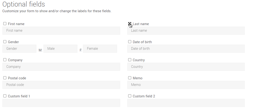 To generate your form, first select the language. Then choose the fields you need and adjust their labels.