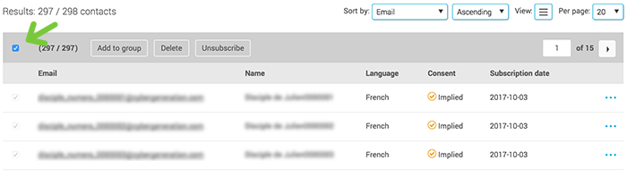 You can select all the contacts in a group by checking the box on the left-hand side above the list of contacts. The total number of selected contacts will show up at the top of the menu. Important: all contacts in this results set will be selected, not only those on the active page.