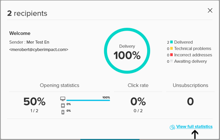 To view detailed statistics for the mailing, click on the link View full Statisticsat the bottom right of the box. The page Mailing statistics will open in a new tab in your browser.