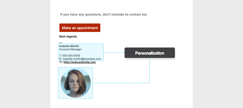 Create the effect of a conversation between you and your recipient by personalizing the email sender as well. For example, send the email in the name of an employee rather than just the company name. (e.g.: Isabelle from XYZ Company rather than just XYZ Company)