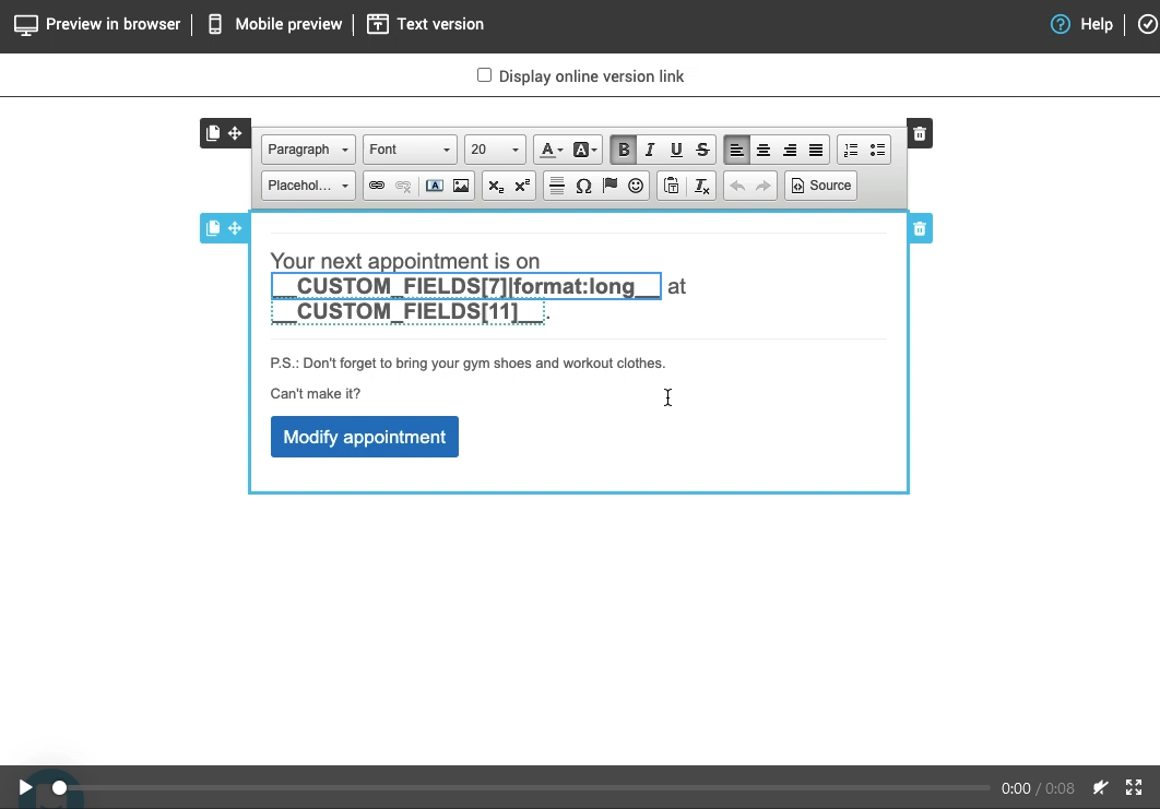 Don't panic if you forget to apply the necessary corrections before sending out your email! The default display format of this field placeholder will be used instead. See default formats >