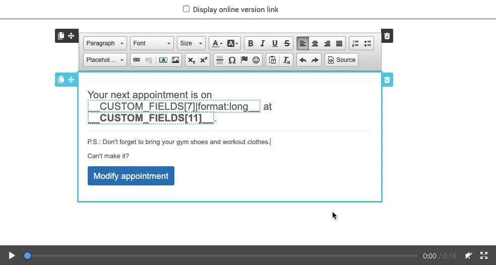 3. In the tools above the text block, open the Placeholders drop-down list and select the appropriate field. A code will be added to your email.