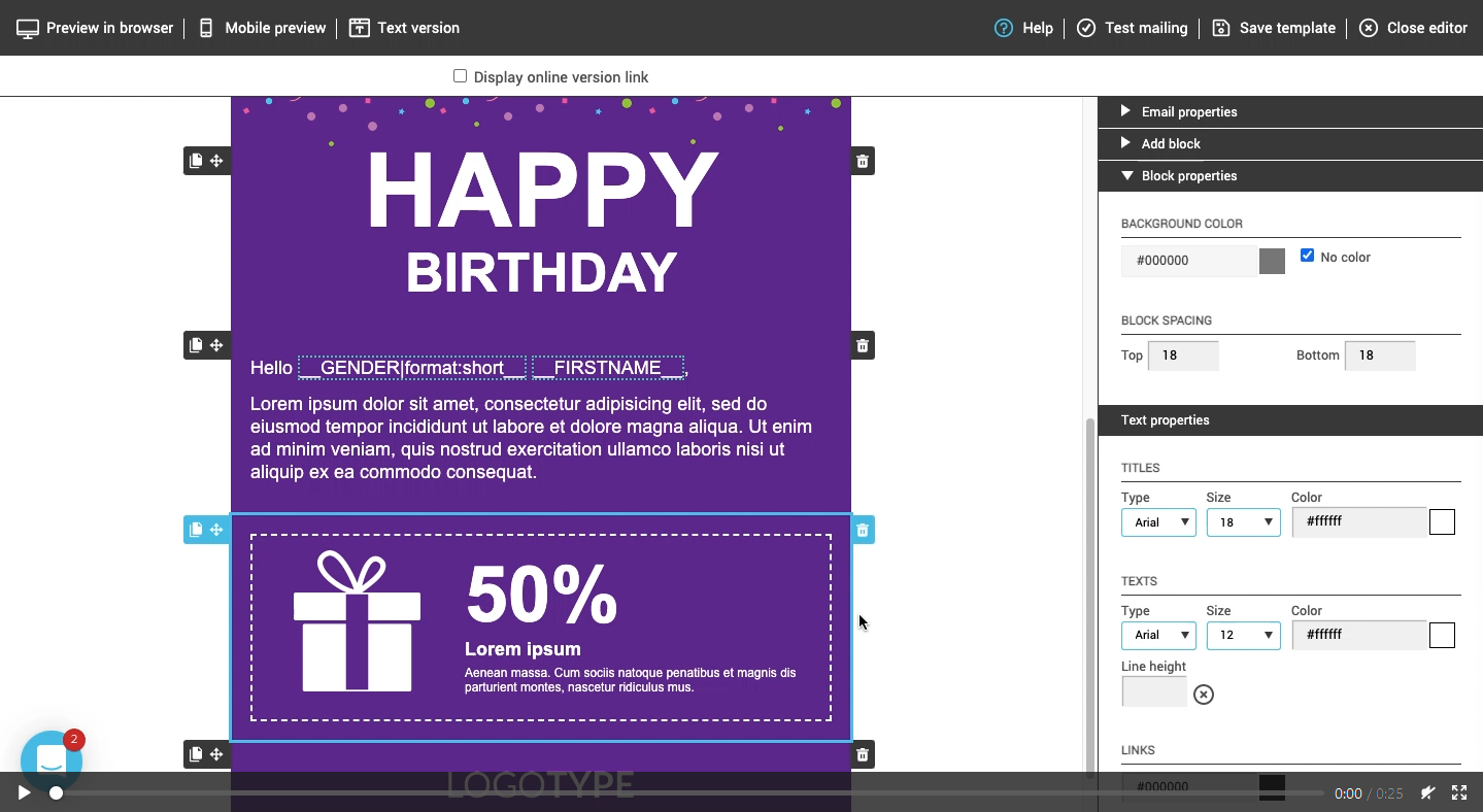 To be able to add personalized greetings or other information into your email, be sure to complete your contacts’ details with the information you need. Learn more >