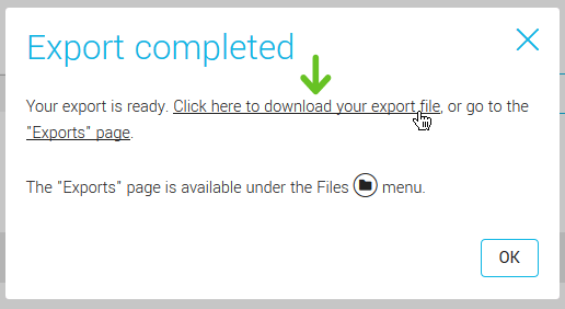 - Once the export completed, a dialog box will appear on your screen. Click the link to immediately download your export file. The file will be available in your browser's downloads and you'll be able to choose if you want to open it immediately or download the file to your computer.
