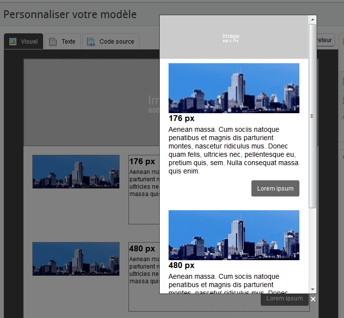 Lorsque vous utilisez des blocs d'images, privilégiez des images dont la largeur varie de 600 px et plus, car elle pourra s'ajuster proportionnellement au format de l'image en décochant l'option "Utiliser ces dimensions"). Si votre image doit faire la pleine largeur du modèle, elle devrait avoir au moins 600 px.