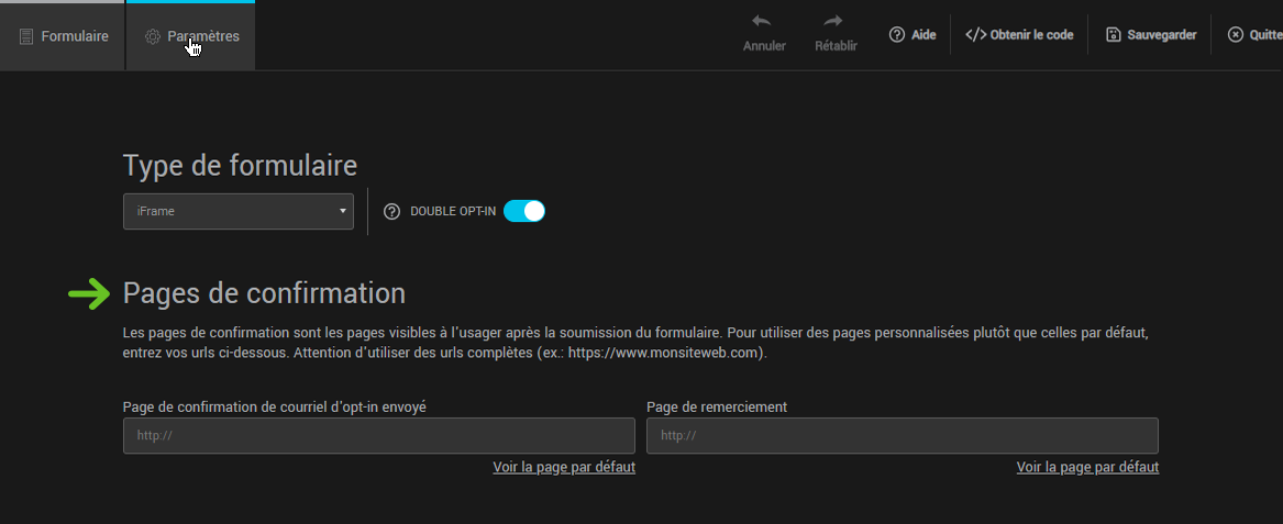 Pour visualiser les pages de confirmation par défaut, cliquez sur les liens Voir la page par défaut situés sous les champs. Si vous souhaitez les utiliser, laissez tout simplement ces champs vides.