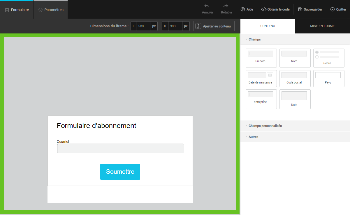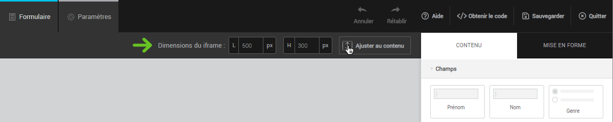 Si votre formulaire est de type iframe, la barre du haut vous permettra d’ajuster ses dimensions. Entrez la largeur et la hauteur souhaitée pour que l’aperçu soit mis à jour. Si vous le souhaitez, utiliser le bouton Ajuster au contenu pour que la hauteur se remplisse par elle-même selon le contenu du formulaire.