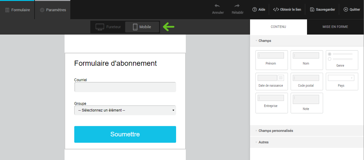 Lorsque vous créez un formulaire hébergé, vous pouvez changer entre l’aperçu fureteur et mobile par l’interrupteur dans la barre du haut. Toutes les modifications que vous effectuez dans l’un ou l’autre des aperçus sont appliquées pour les deux.
