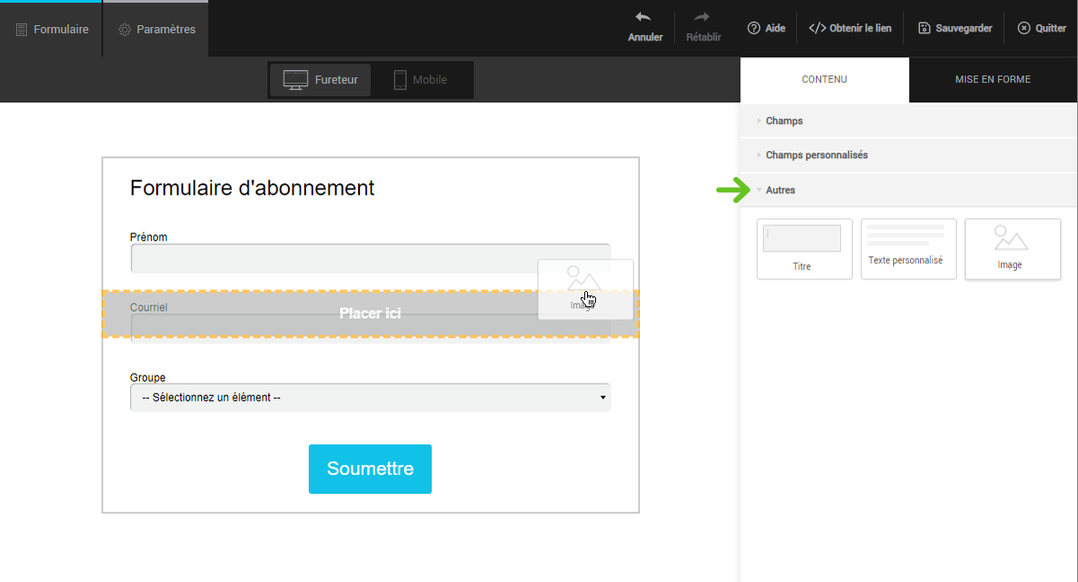 À partir de l’onglet Contenu de la barre latérale de droite, ouvrez le panneau Autres pour accéder à plus d’éléments. Pour ajouter un bloc à votre formulaire, il suffit de glisser et déposer l’élément souhaité en maintenant le bouton de la souris enfoncé. Il n’y a pas de limite au nombre de titres, textes et images que vous pouvez utiliser.