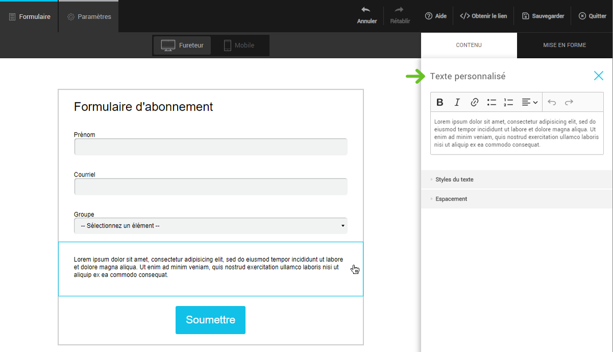 Dans l’aperçu du formulaire, cliquez sur l’élément que vous souhaitez éditer pour afficher ses options dans la barre latérale de droite. Vous pouvez alors en modifier le contenu et les styles.