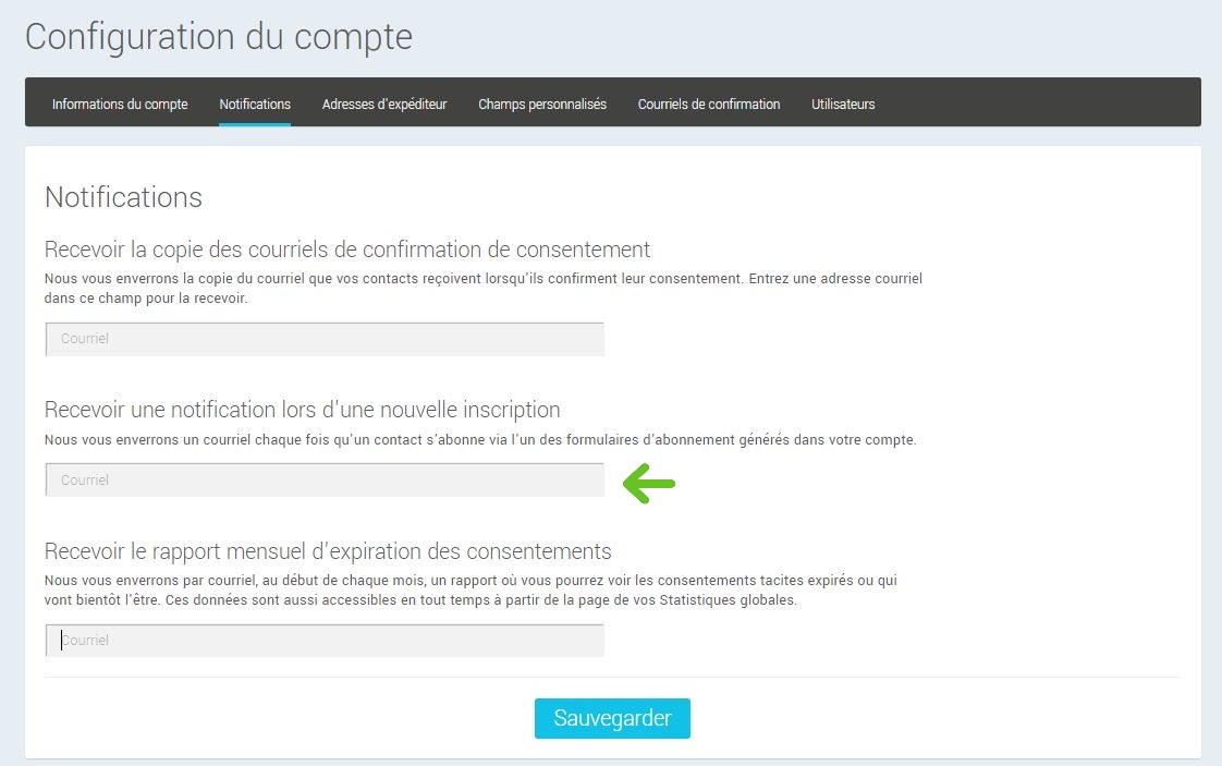 2. Inscrivez une adresse courriel dans le champ sous Adresse pour recevoir une notification lors d'une nouvelle inscription.