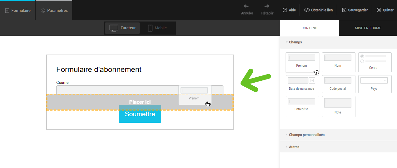 À partir de l'onglet Contenu situé dans la barre latérale à votre droite, glissez et déposez, en maintenant le bouton gauche de la souris enfoncé, les champs désirés dans le formulaire. En plus des champs réguliers, vous pouvez également ajouter des champs personnalisés.