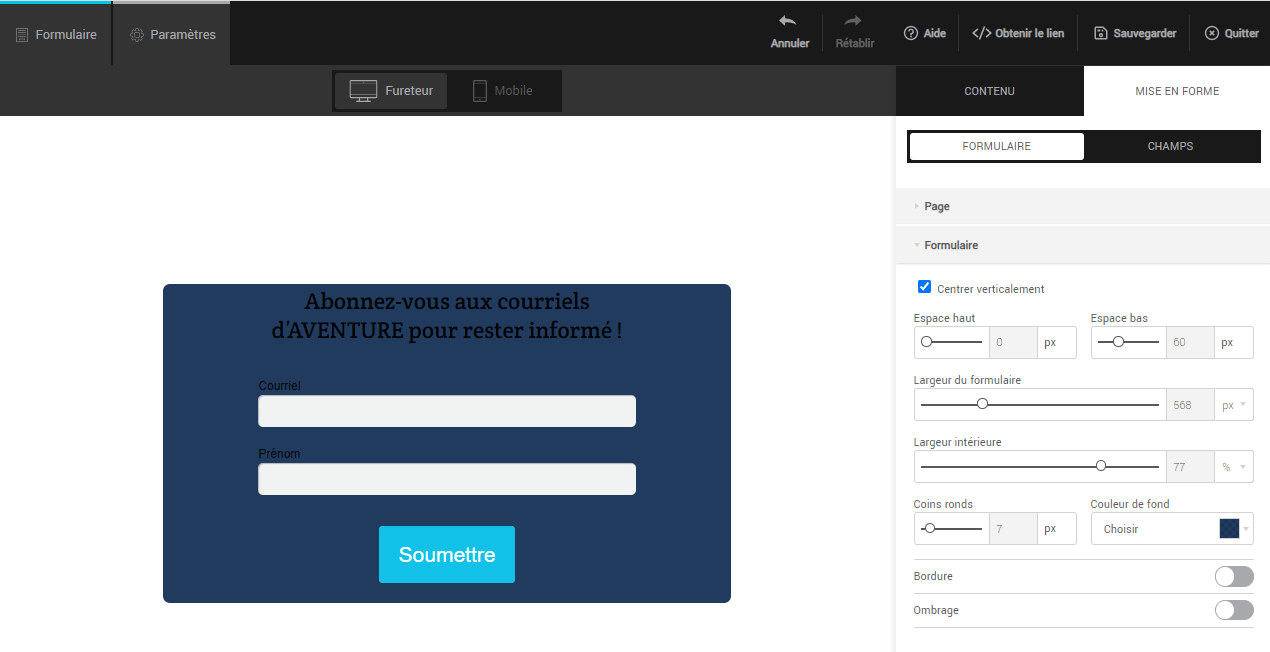 5. Lâchez votre fou et explorez les multiples options de personnalisation disponibles ! Vous avez le plein contrôle du visuel de votre formulaire : centrez-le verticalement, ajustez l'espacement autour de votre formulaire et ses dimensions, optez pour des coins carrés ou des coins ronds, ajoutez de l'ombrage... les possibilités sont infinies.
