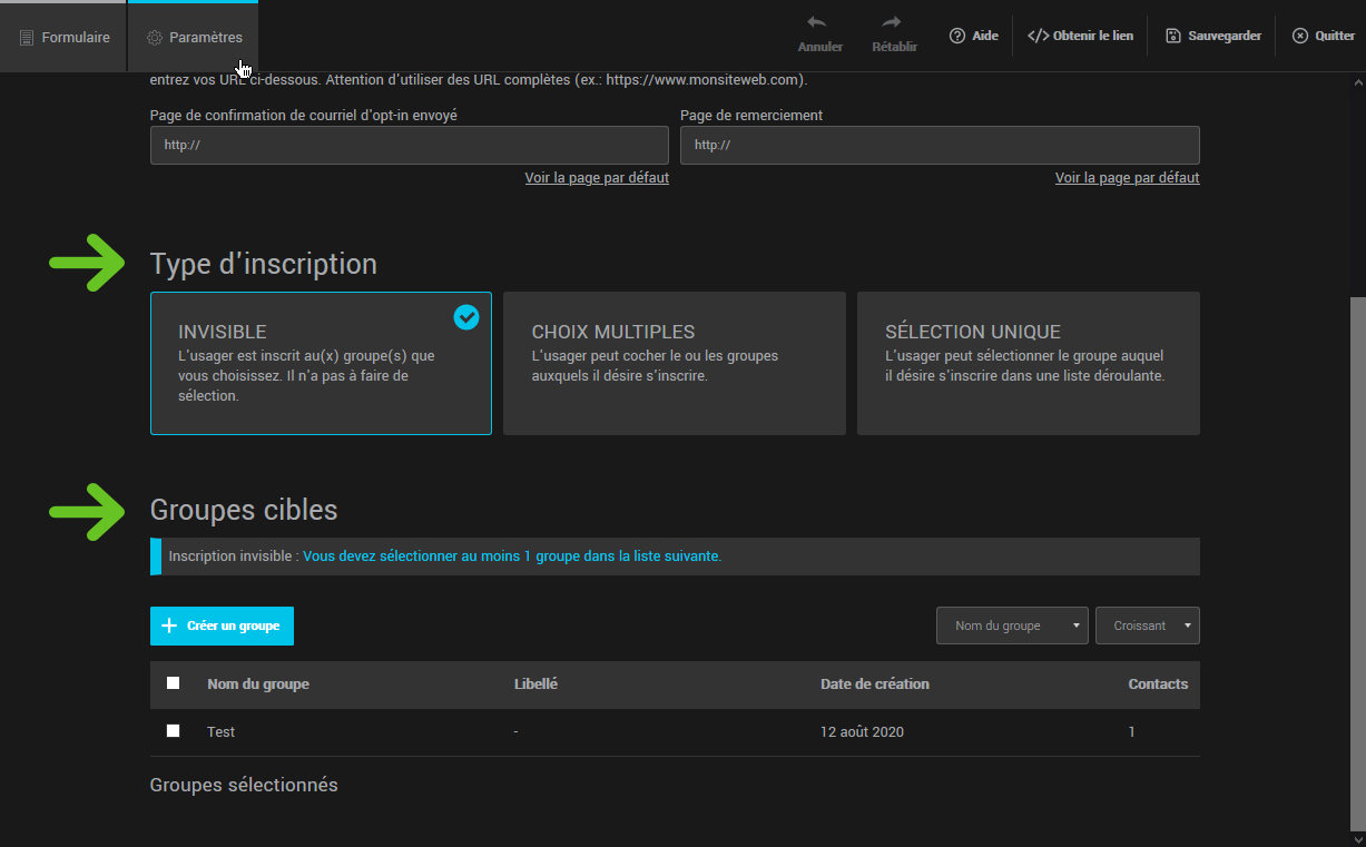 5. Configurez les groupes dans lesquels seront ajoutés les contacts qui s'inscriront à votre formulaire.