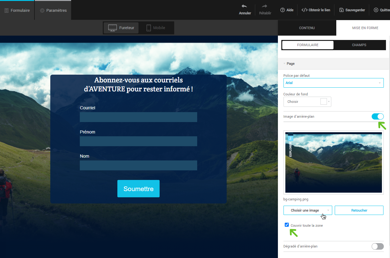 Il est également possible de personnaliser la couleur de fond et d'ajouter un dégradé dans la page du formulaire. Vous pouvez même utiliser simultanément tous ces effets. En savoir plus >