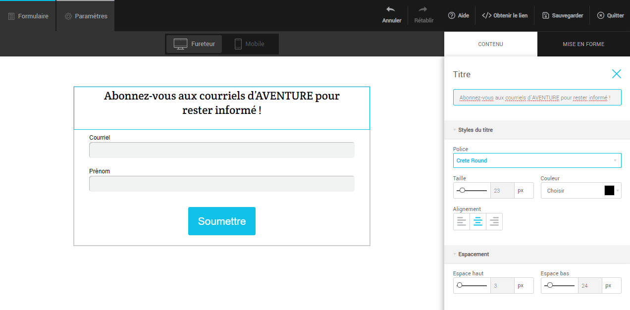 Pour avoir rapidement un aperçu de votre formulaire sur différentes plateformes sans quitter l'éditeur, appuyez sur les interrupteurs Fureteur et Mobile (situés au haut du visuel du formulaire). Cette option vous permettra de basculer d'un mode plein écran à un affichage sur téléphone. Veuillez cependant prendre note que toutes les modifications que vous effectuez dans l’un ou l’autre des aperçus sont appliquées pour les deux. Cette option est disponible seulement dans les formulaires hébergés.