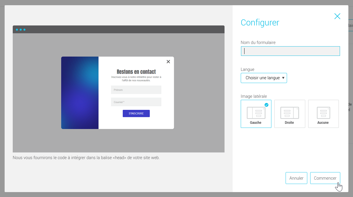 3. Dans la fenêtre Configurer, entrez un nom pour votre formulaire, puis choisissez sa langue et si vous souhaitez que celui-ci soit accompagné d’une image latérale.