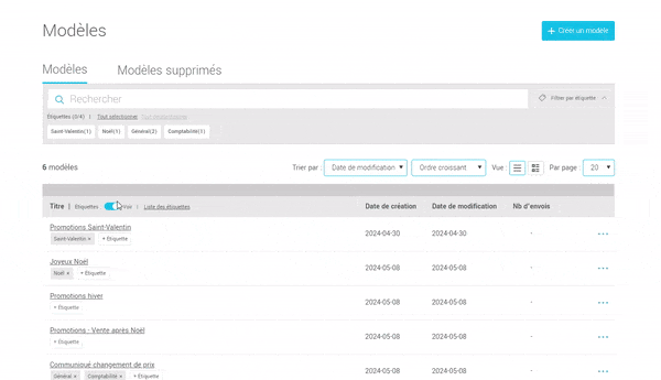 Vous pouvez ajouter autant d'étiquettes que vous le souhaitez à vos modèles, ce qui vous permet de les catégoriser de plusieurs façons. Par exemple, un modèle peut être classé à la fois sous "Promotion", "Noël" et "Coupons". Une fois les étiquettes en place, il vous suffit de cliquer sur leur nom dans le champ de recherche pour filtrer la liste de vos modèles. Il est également possible de rechercher par plusieurs étiquettes simultanément. Vous pouvez inclure jusqu'à 30 caractères dans le nom de vos étiquettes. Le nom de chaque étiquette doit être unique.
