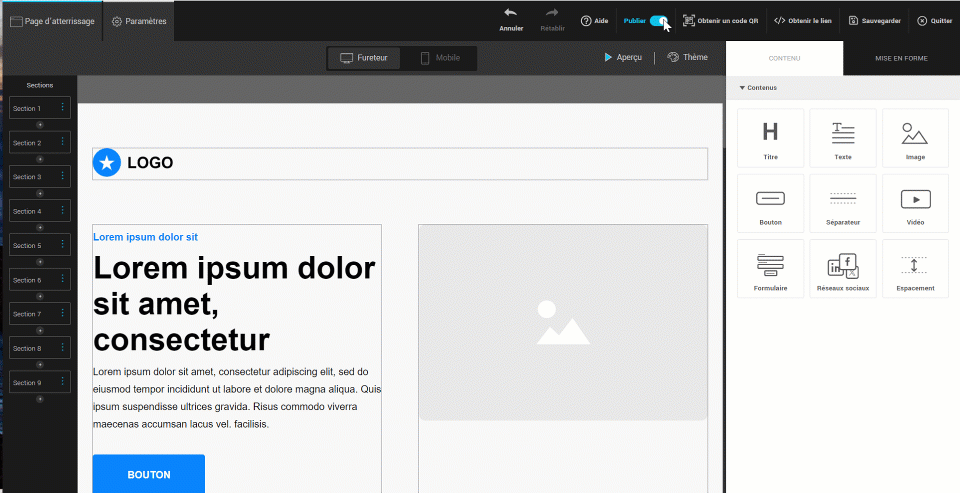 Pour publier votre page, activez l'interrupteur situé dans la liste de vos pages (via le menu ) ou en haut de l'éditeur.