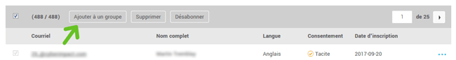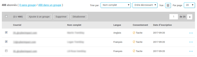 1. Sélectionner un ou plusieurs contacts en cochant la case associée à leur adresse courriel dans la liste.