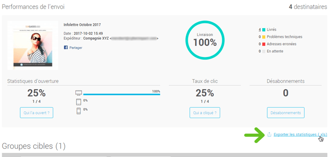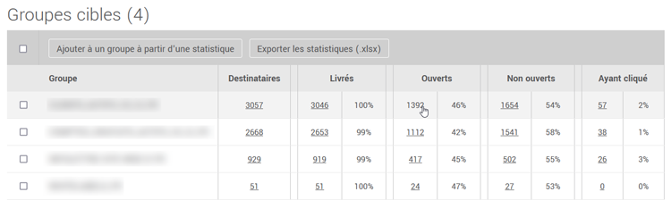Si vous avez effectué un envoi à plusieurs groupes cibles, il peut être intéressant de comparer les données pour chacun d'eux. Celles-ci sont disponibles dans le tableau Groupes cibles, sous le graphique de perfomance de l'envoi. Vous pouvez cliquer sur les chiffres soulignés dans le tableau pour accéder à la liste des contacts concernés par la statistique.
