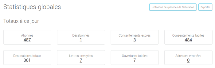 Pour consulter les statistiques globales de votre compte, telles que le nombre d'abonnés, de contacts désabonnés, de consentements exprès ou tacites, d'adresses erronées, des lettres envoyées et du nombre d'ouvertures totales, cliquez sur Statistiques Consulter vos statistiques dans la barre d'outils rapides à la gauche de votre compte.