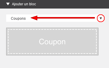 Dans la section "Ajouter un bloc" du panneau latéral, repérez la catégorie "Coupons" dans le sélecteur de catégorie de bloc.